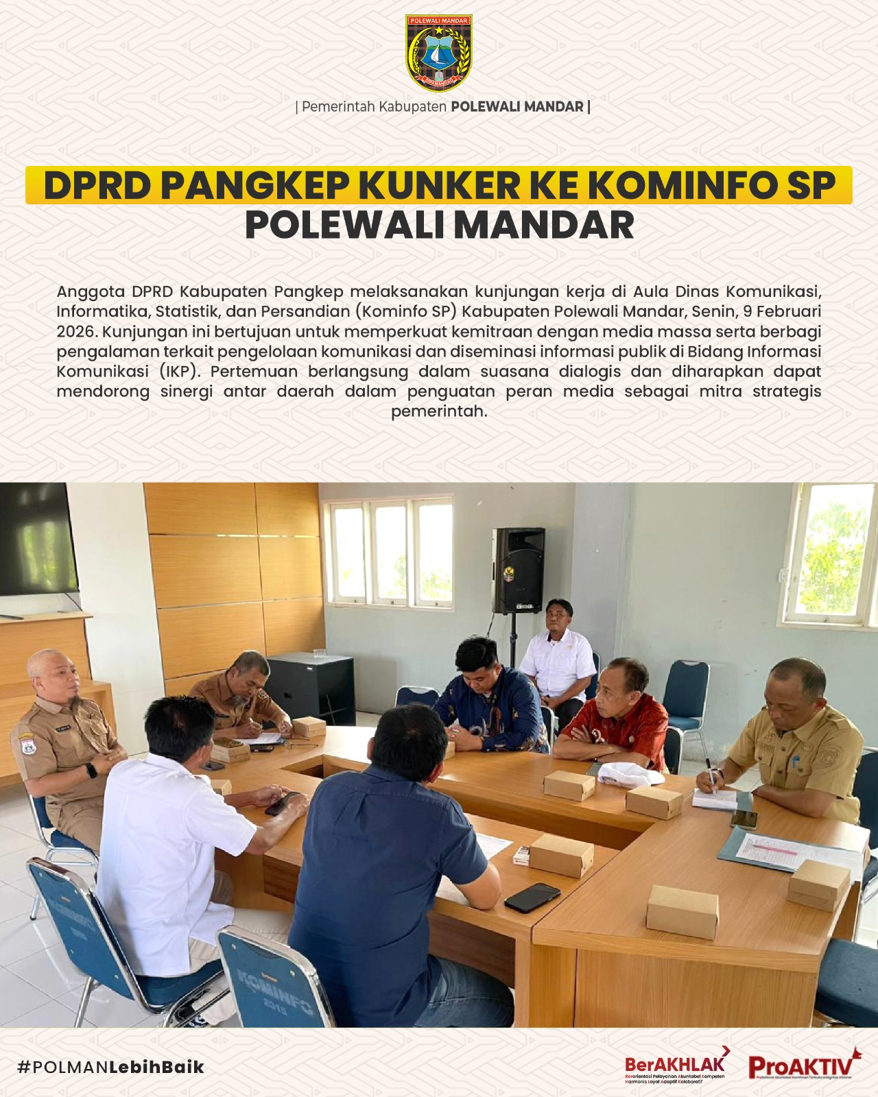 Polewali Mandar – Menjelang bulan suci Ramadan, Dinas Komunikasi, Informatika, Statistik, dan Persandian (Kominfo SP) Kabupaten Polewali Mandar menggelar kegiatan ngaji pagi yang dirangkaikan usai dialog kinerja, Rabu (28/01/2026).Kegiatan ini diikuti oleh seluruh jajaran pimpinan dan pegawai Dinas Kominfo SP Polewali Mandar. Dialog kinerja yang dilaksanakan sebelumnya membahas evaluasi kinerja Sekretariat dan setiap bidang, yakni IKP, TIP, dan Statistik, baik terkait kendala pelaksanaan tugas maupun rencana tindak lanjut dalam rangka peningkatan kinerja organisasi.Ngaji pagi berlangsung dalam suasana khidmat dan penuh kebersamaan sebagai upaya memperkuat nilai spiritual aparatur sekaligus menumbuhkan etos kerja positif di lingkungan Dinas Kominfo SP Polewali Mandar.Andi Himawan Jasin, ST, M.Si Kepala Dinas Kominfo SP Polewali Mandar menyampaikan bahwa kegiatan ngaji pagi menjadi momentum penting untuk menyeimbangkan profesionalisme kerja dengan penguatan karakter dan nilai kei... Selengkapnya...